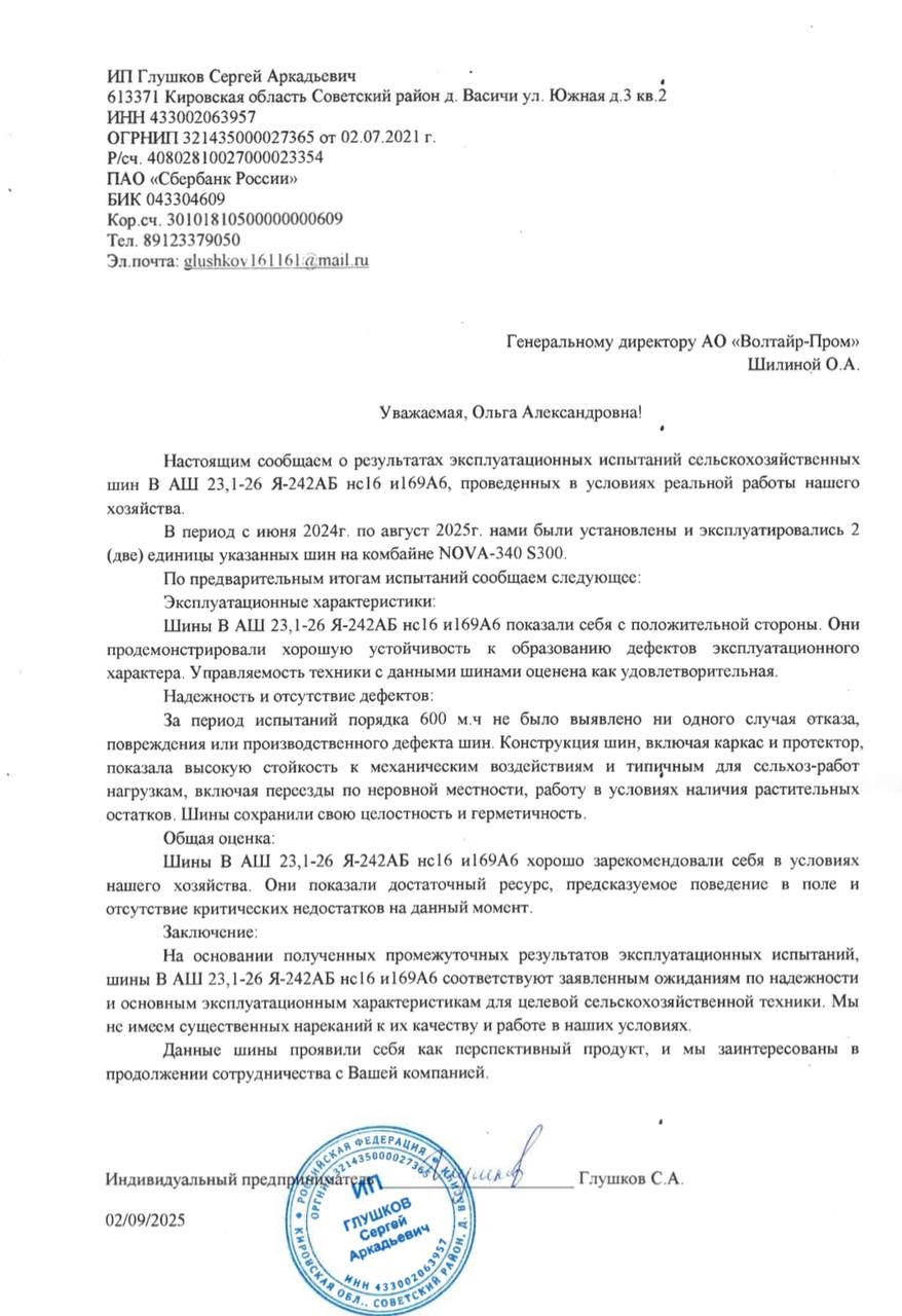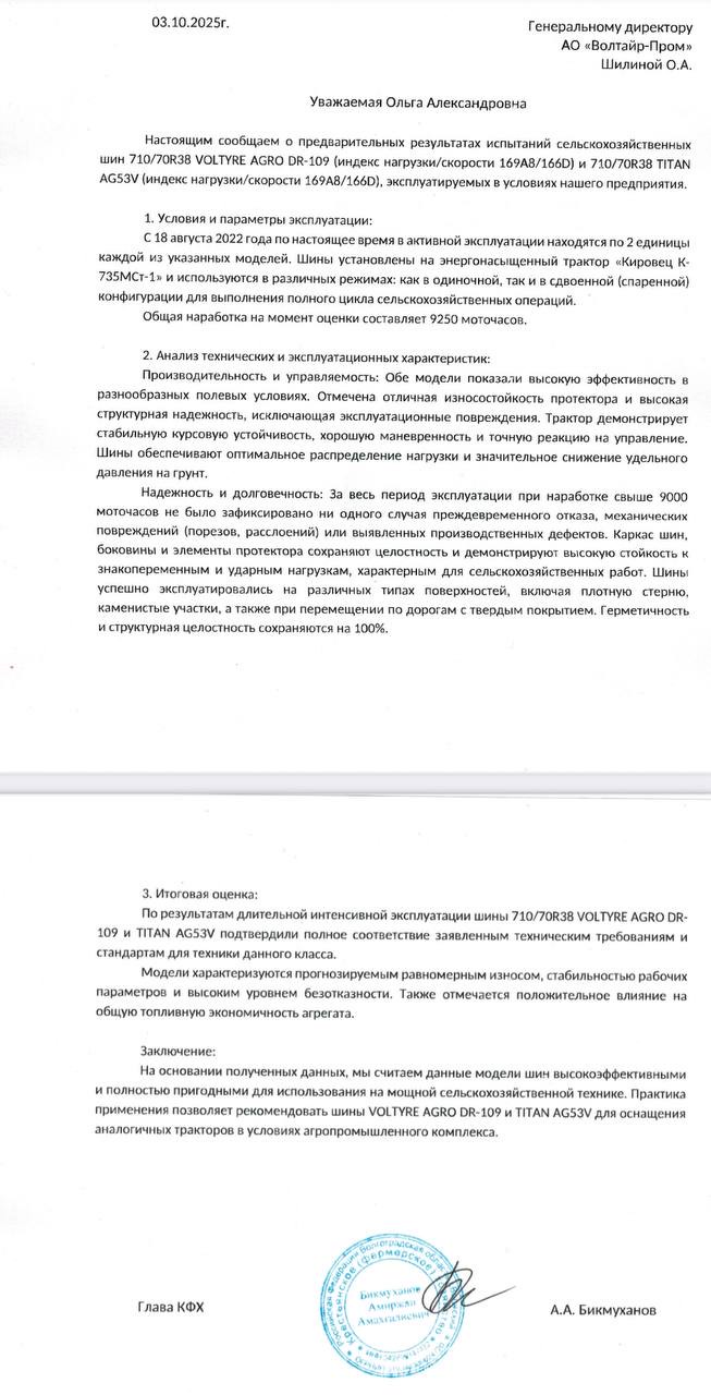 💬 Представители хозяйств подчеркнули, что шины VOLTYRE AGRO и TITAN демонстрируют отличные результаты при интенсивной эксплуатации — без повреждений и дефектов даже после тысяч моточасов работы.