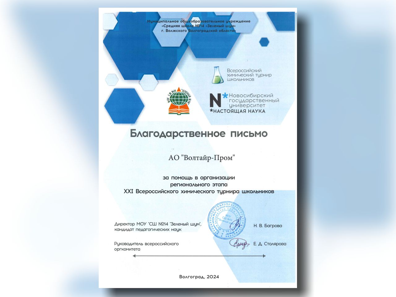 Учащиеся школ Волжского и Волгограда решали сложные практикоориентированные задачи, демонстрируя свои знания в области химии. Химический турнир является мощной площадкой для объединения школьников, увлечённых химией, представителей высших учебных заведений и промышленности города. По итогам турнира победители и призёры получили брендированные подарки от АО "Волтайр-Пром".