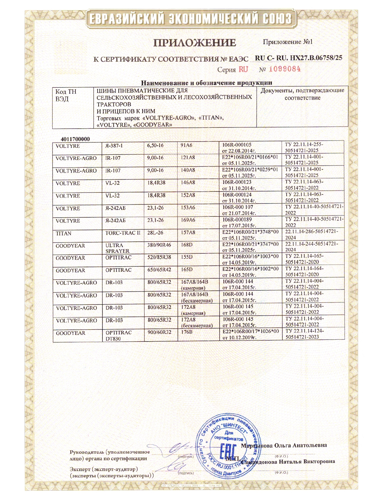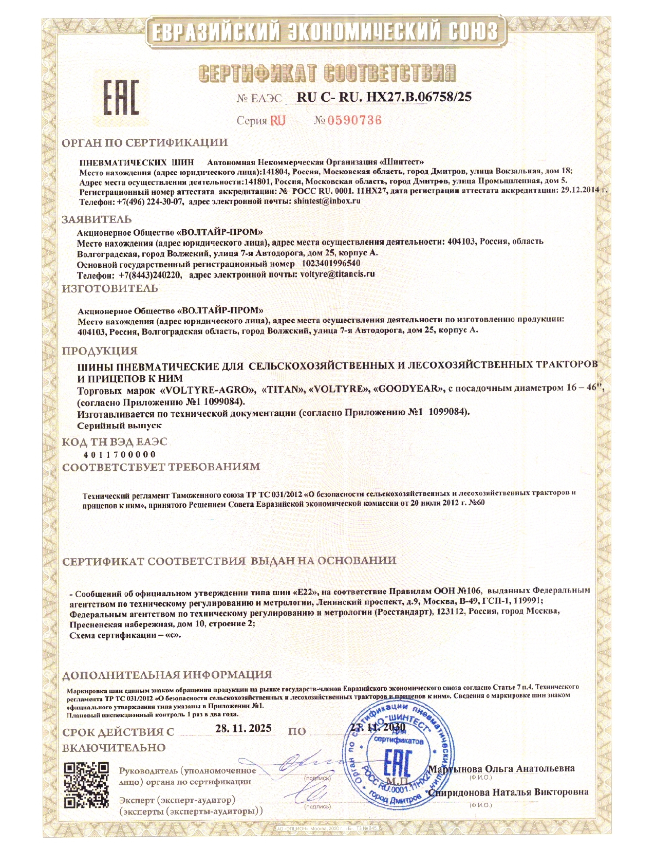 Сертификат соответствия на сельскохозяйственные шины В АП 16,5/85-24 TITAN AG62H б/к нс14 и165А6/153А6 - код ЕНС 12218711651, В АП 16,5/85-24 VOLTYRE-AGRO DF-136 б/к нс14 и165А6/153А6 – код ЕНС 12218716501